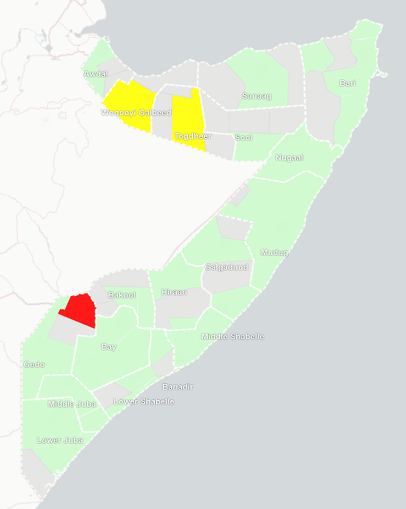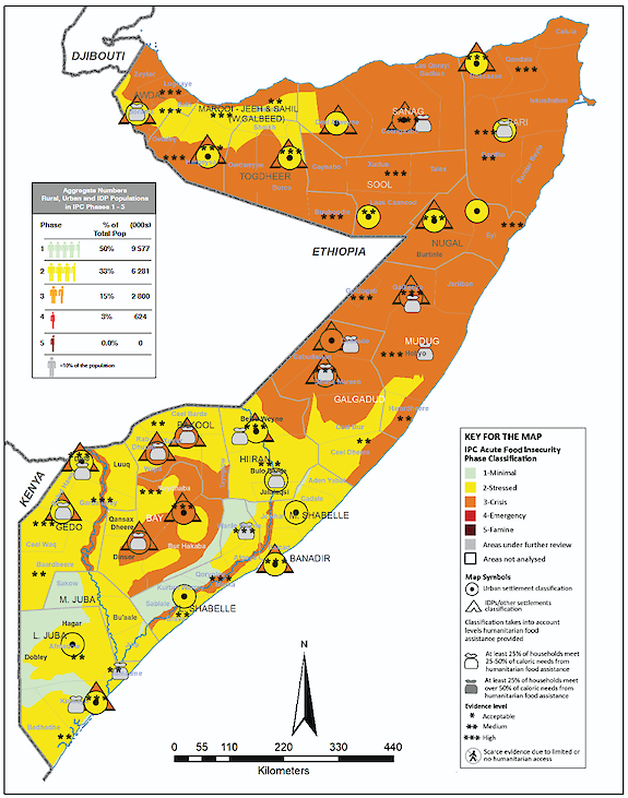 FEWS NET verwendet dazu folgendes Klassifizierungssystem (Integrated Phase Classification, IPC): In Stufe 1 der fünfstufigen Skala, auch „Minimal“ genannt, sind die Haushalte in der Lage, den Bedarf an lebensnotwendigen Nahrungsmitteln und Nicht-Nahrungsmitteln zu decken, ohne atypische und unhaltbare Strategien für den Zugang zu Nahrung und Einkommen zu verfolgen. In Stufe 2, auch „Stressed“ genannt, weisen Haushalte nur einen gerade noch angemessenen Lebensmittelverbrauch auf und sind nicht in der Lage, sich wesentliche, nicht nahrungsbezogene Güter zu leisten, ohne dabei irreversible Bewältigungsstrategien anzuwenden. In Stufe 3, auch als „Crisis“ bezeichnet, weisen Haushalte Lücken im Nahrungsmittelkonsum mit hoher oder überdurchschnittlicher akuter Unterernährung auf oder sind nur in geringem Maße in der Lage, ihren Mindestnahrungsmittelbedarf zu decken – und dies nur, indem Güter, die als Lebensgrundlage dienen, vorzeitig aufgebraucht werden bzw. durch Krisenbewältigungsstrategien. In Stufe 4, „Emergency“, weisen Haushalte entweder große Lücken im Lebensmittelkonsum auf, was zu einer sehr hohen akuten Unterernährung führt, oder sind nur durch den Einsatz von Notfallstrategien und der Liquidation von Vermögenswerten in der Lage, diese Lücken abzuschwächen. Die fünfte und letzte Stufe der Skala, „Famine“, bedeutet einen extremen Mangel an Nahrungsmitteln oder anderen Grundbedürfnissen, obwohl Bewältigungsstrategien angewendet werden; es sind Hunger, Tod, bittere Armut und extrem kritische akute Unterernährung zu beobachten (FEWS NET, ohne Datum siehe auch: FSNAU, 6. April 2025, S. 7). Auf der folgenden Karte der FSNAU zu Ernährungssicherheit in Somalia findet sich eine Prognose für den Zeitraum April bis Juni 2025. Die Farbe Orange entspricht Stufe 3: