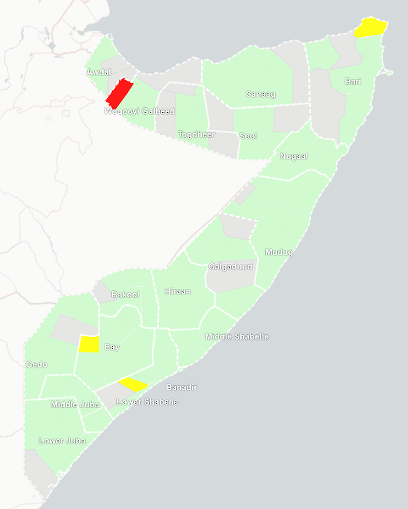 Zudem können auf der Website Informationen zur Entwicklung von Löhnen im Vergleich mit Getreidepreisen (Kilogramm Getreide für Tageslohn) abgerufen werden. Abweichungen vom Fünfjahresschnitt werden mit der Farbe Rot („Alarm“ – Rückgang ≥ 3 kg) und der Farbe Gelb („Alert“ – Rückgang um 1 bis 2 kg) ausgewiesen (FSNAU, ohne Datum(b); FSNAU, ohne Datum(c)). Folgende Landkarte stellt die Entwicklungen im August 2025 dar: