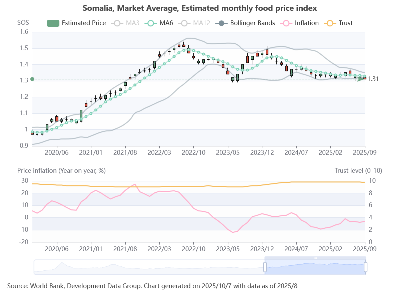Auf der Website der World Bank können Daten zu Nahrungsmittelpreisen (darunter Mais, Sorghum und Speiseöl) auf verschiedenen Märkten in Somalia abgerufen werden (Bakaara market befindet sich in Mogadischu, Anm. ACCORD). Zudem zeigt folgende Grafik Nahrungsmittelindex und Inflationsrate: